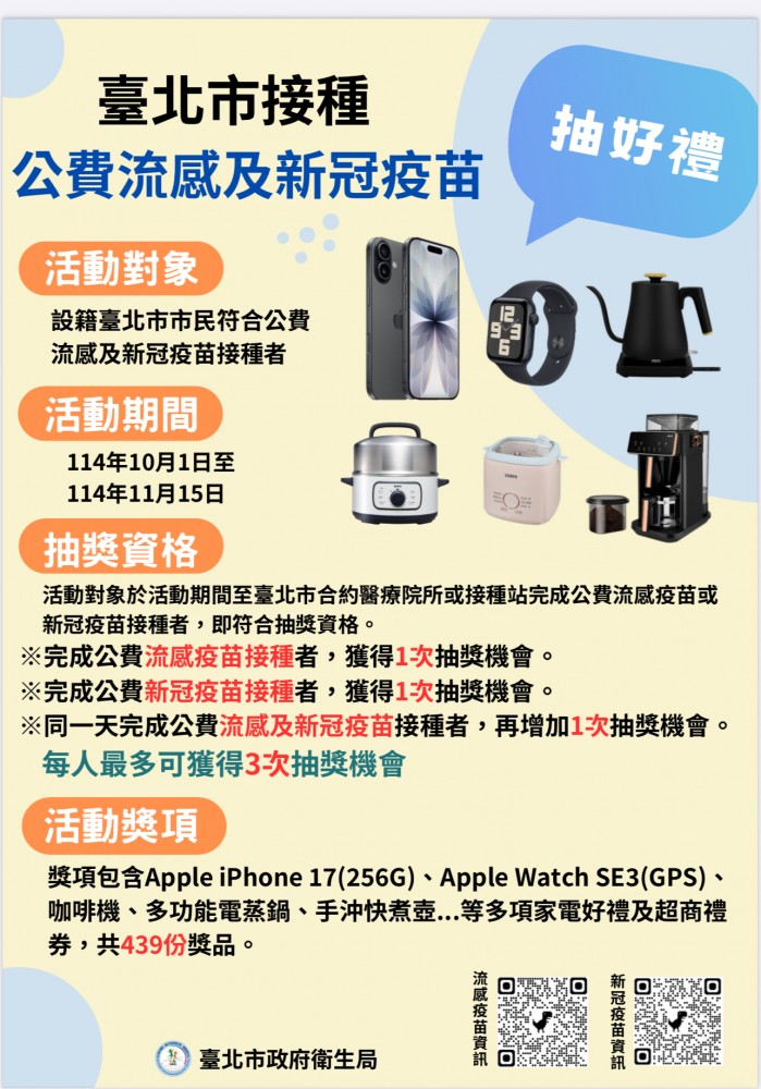 一、活動對象:設籍臺北市市民符合公費流感及新冠疫苗接種者 二、活動期間:114 年 10 月 1 日至 114 年 11 月 15 日 三、抽獎資格:活動對象於活動期間至臺北市合約醫療院所或接種站完成公費流感疫苗或新冠疫苗接種者,即符合抽獎資格。 (一)完成公費流感疫苗接種者,獲得 1 次抽獎機會。 (二)完成公費新冠疫苗接種者,獲得 1 次抽獎機會。 (三)同一天完成公費流感及新冠疫苗接種者,再增加 1 次抽獎機會。 註:每人最多可獲得 3 次抽獎機會