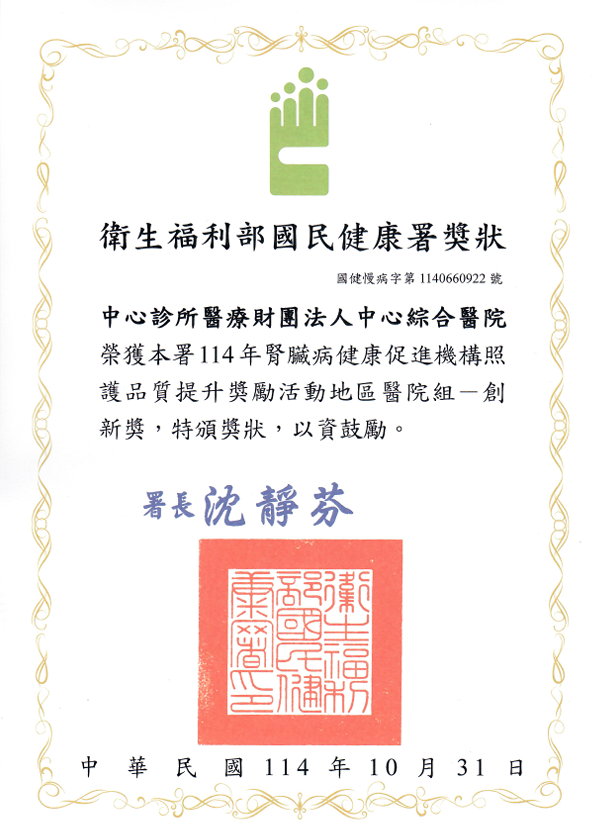 本院榮獲國健署114年腎臟病健康促進機構照護品質提升獎勵活動地區醫院組--銀獎