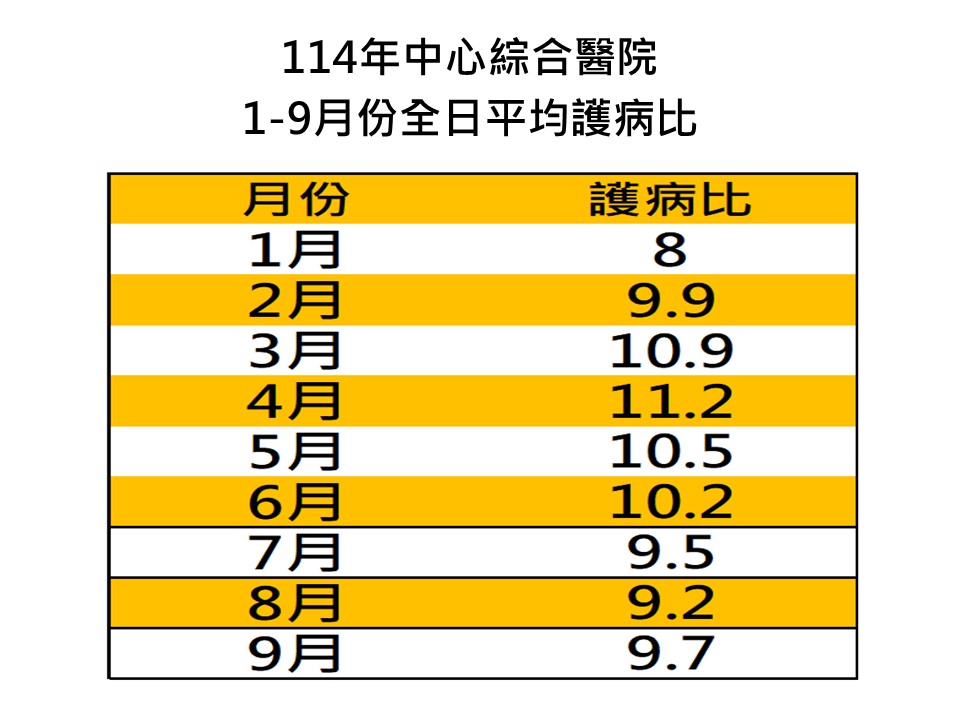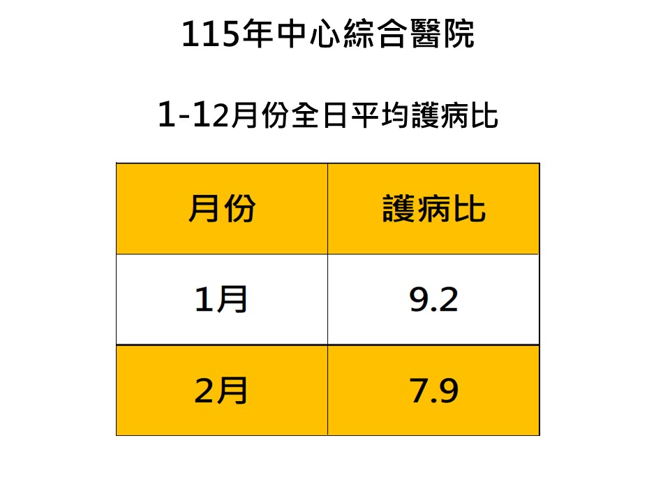 依據「醫療機構設置標準」第十二條之一 第三條醫院及第五條精神科醫院,應依住院 病人人數,配置適當之護產人員;其急性一般病床之全日平均配置比例(以下簡稱「護病比」),按每一護產人員照護之病人人數,規定如下: