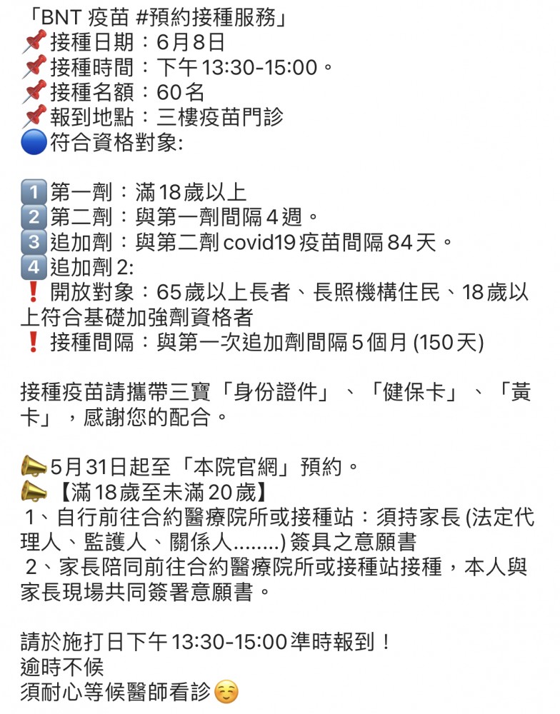BNT疫苗預約接種服務 6/8 60名