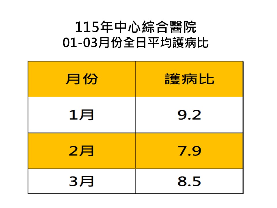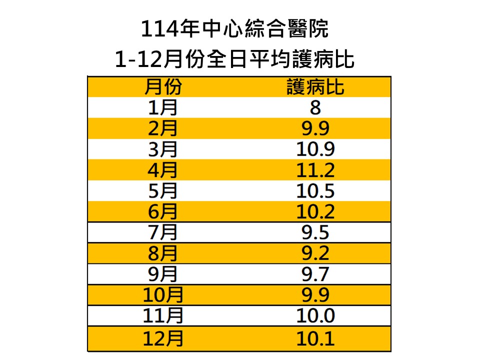 依據「醫療機構設置標準」第十二條之一 第三條醫院及第五條精神科醫院,應依住院 病人人數,配置適當之護產人員;其急性一般病床之全日平均配置比例(以下簡稱「護病比」),按每一護產人員照護之病人人數,規定如下:
